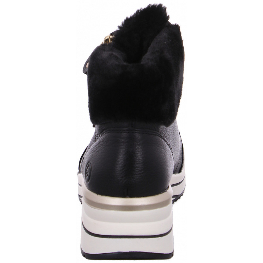 Die kalten Tage werden heiß! Diese asphaltschwarzen remonte Schnürstiefel für Damen aus Glattleder begleiten dich mit Style und bestem Laufkomfort durch die Saison. Eine Schnürung ergänzt den Reißverschluss und sorgt für Funktionalität und Komfort. Der Fellkragen am Schaft rundet das moderne Design perfekt ab. Dank der bewährten remonte Lite ´n Soft Technologie und der herausnehmbaren und gepolsterten Einlegesohle sind die Schnürstiefel federleicht und angenehm zu tragen. Der Schuh ist die perfekte Wahl für große Füße: Er ist in Extraweite geschnitten und in Übergrößen erhältlich. Das kuschelige und sehr warme Schurwoll-Futter und die bewährte remonteTEX-Technologie machen diesen Schnürstiefel zum optimalen Begleiter – perfekt für nasskalte Tage. Das heißt: Endlos schlendern ist überhaupt kein Problem!